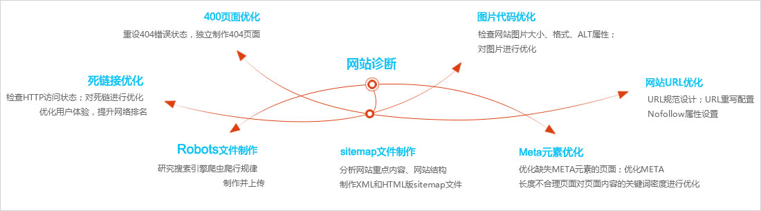 仟億網(wǎng)站優(yōu)化策略的實施包括死鏈接優(yōu)化、404頁面優(yōu)化、Robots文件制作,圖片代碼優(yōu)化、網(wǎng)站URL 優(yōu)化、Sitemap文件制作、Meta元素優(yōu)化七大網(wǎng)站優(yōu)化要素,傳悅從這七個
